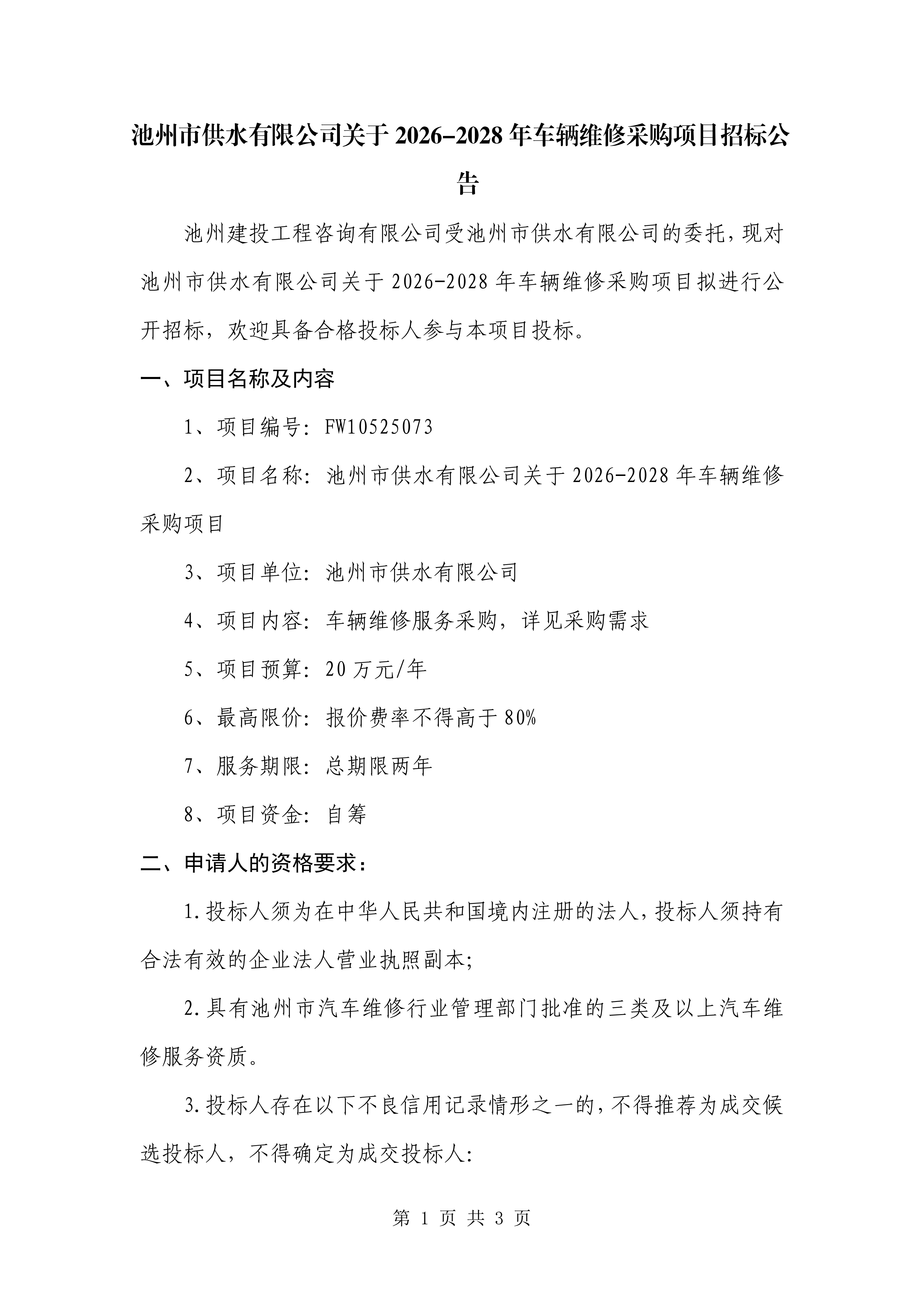 | 池州市供水有限公司关于2026-2028年车辆维修采购项目招标公告 | |