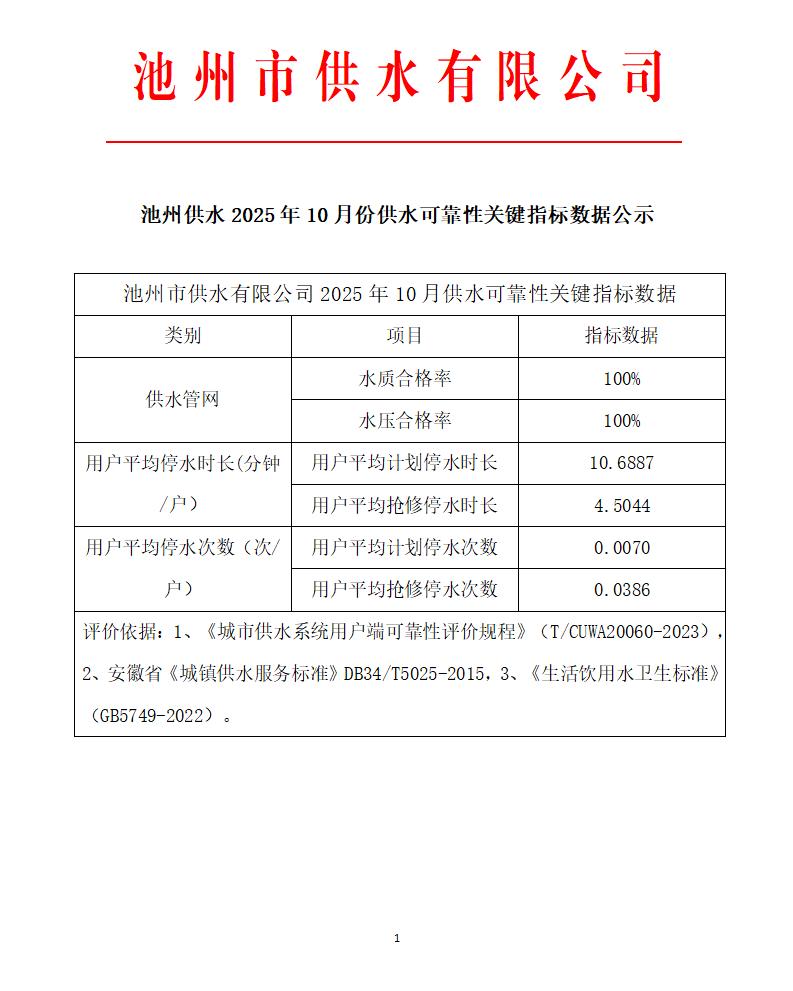 | 池州供水2025年10月份供水可靠性关键指标数据公示 | |