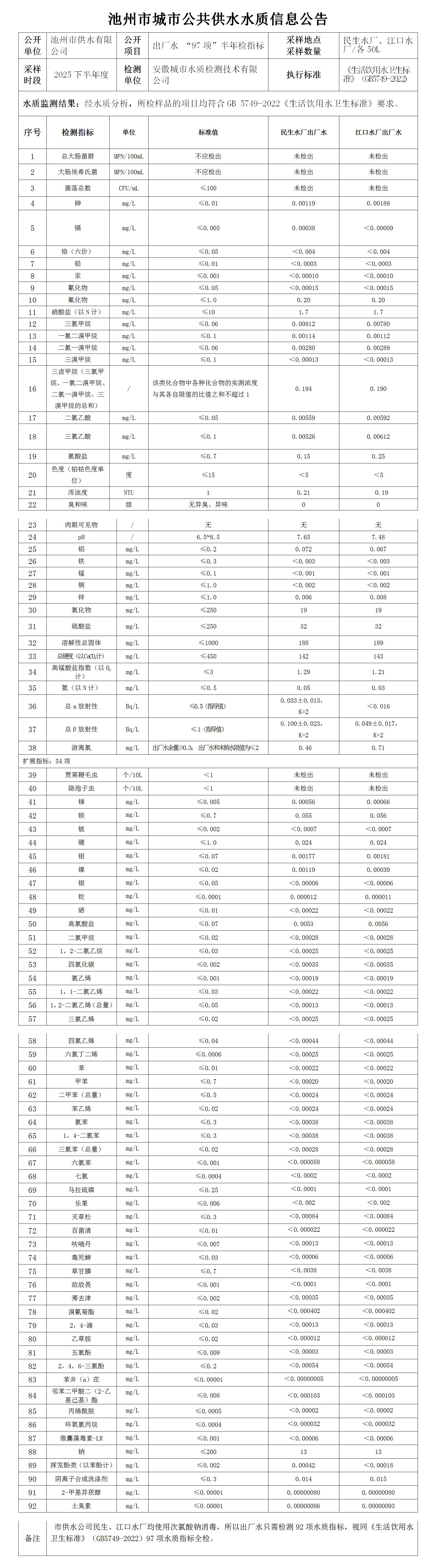 | 池州市城市供水水质信息公告出厂水“97项“2025年下半年全指标 | |
