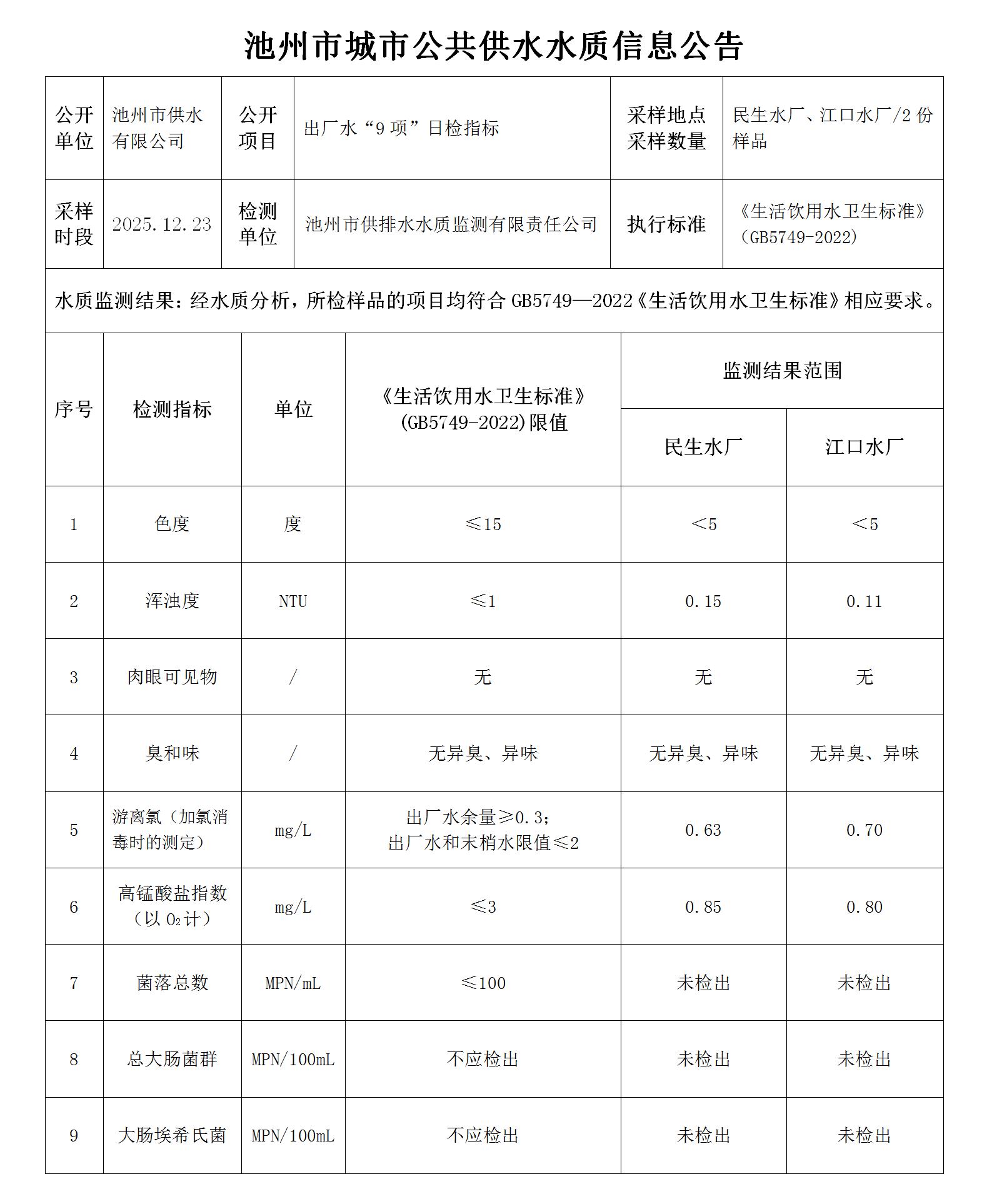 | 池州市城市公共供水水质信息公告出厂水“9项”日检指标2025.12.23 | |