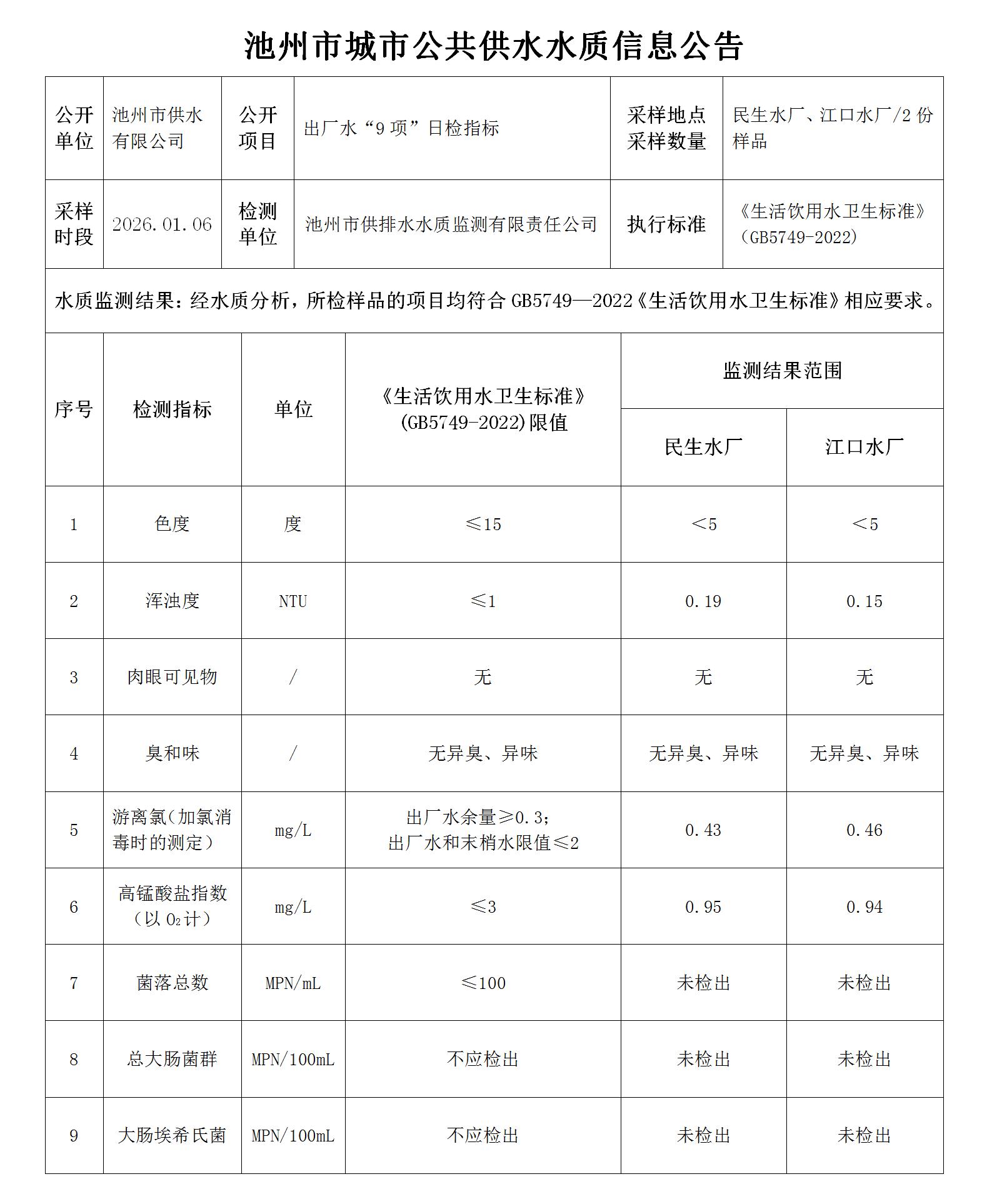 | 池州市城市公共供水水质信息公告出厂水“9项”日检指标2026.01.06 | |