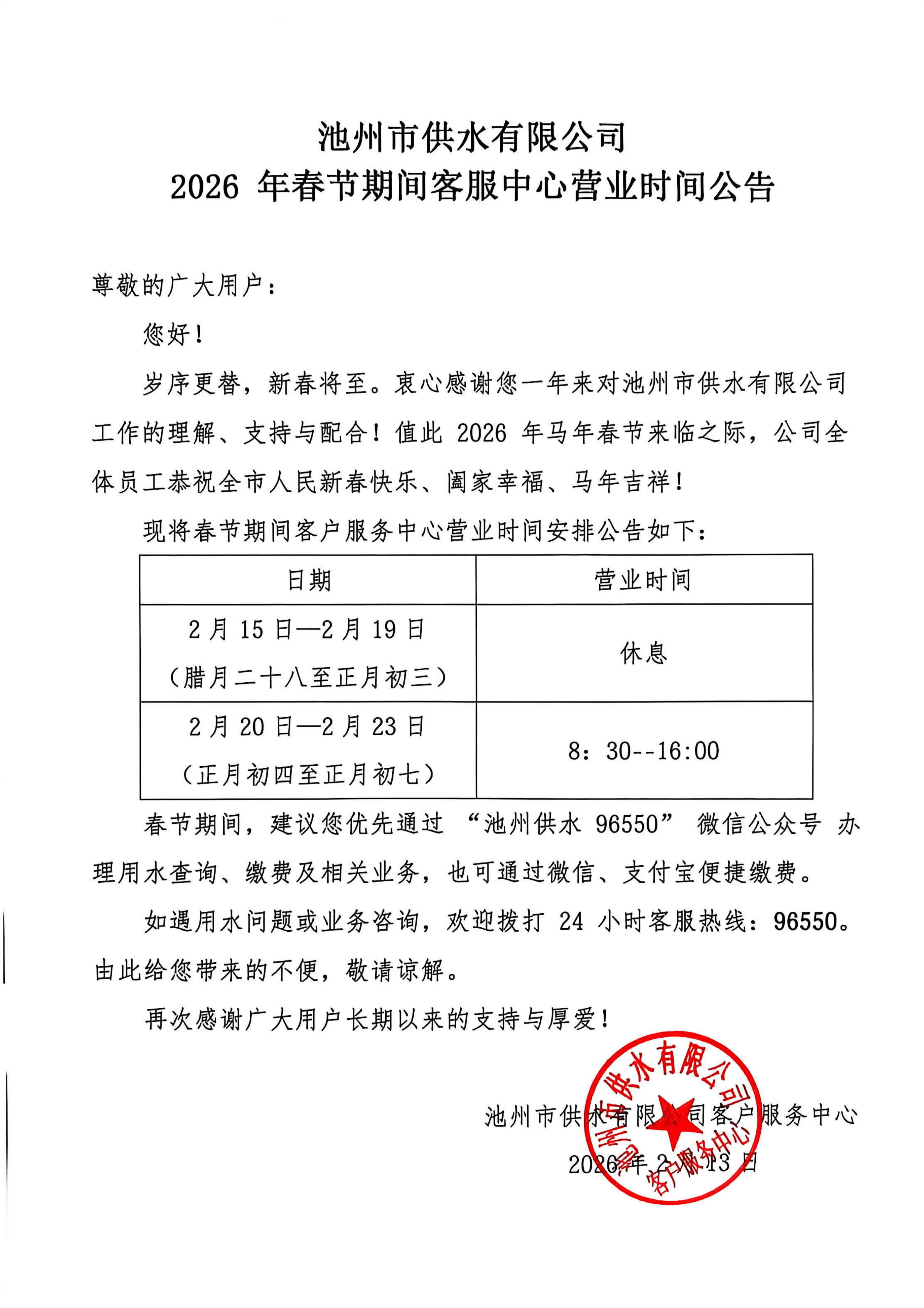 | 池州市供水有限公司2026年春节期间客服中心营业时间公告 | |