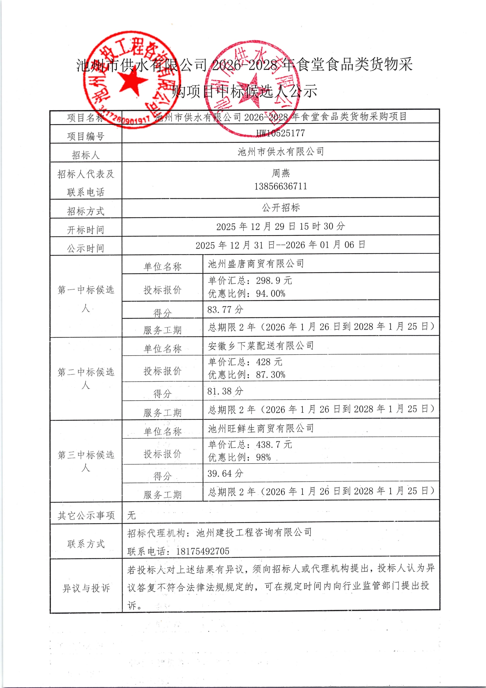 | 池州市供水有限公司2026-2028年食堂食品类货物采购项目中标候选人公示 | |