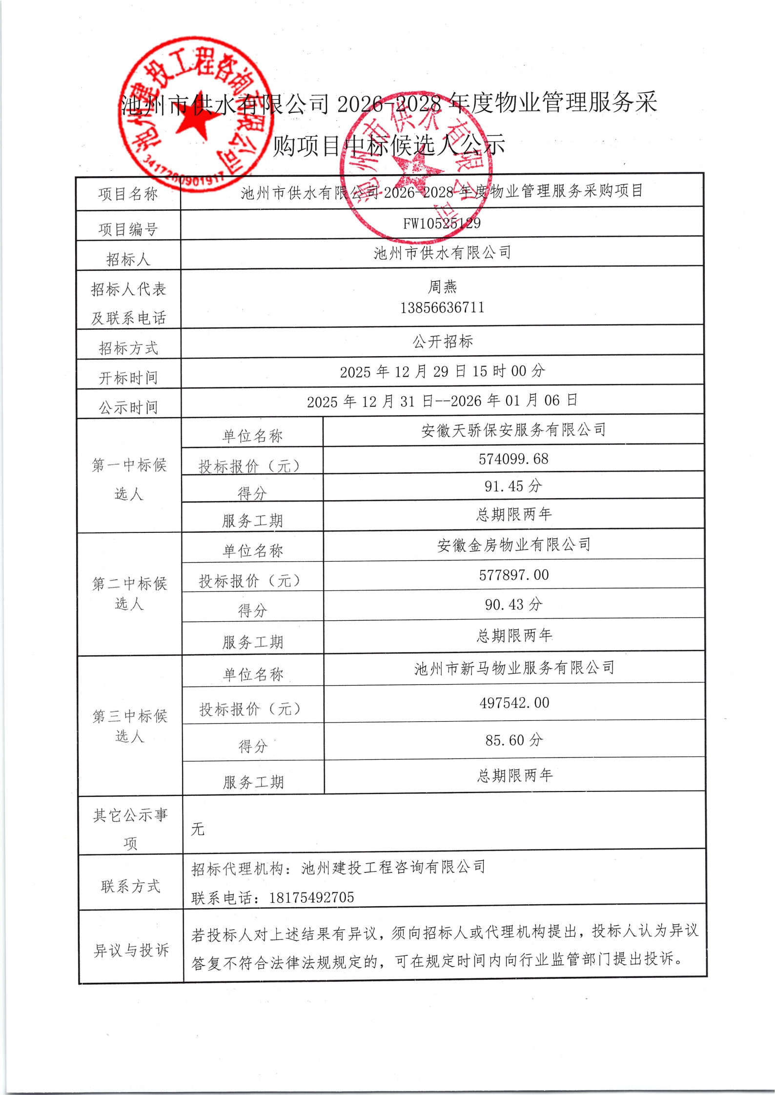 | 池州市供水有限公司2026-2028年度物业管理服务采购项目中标候选人公示 | |