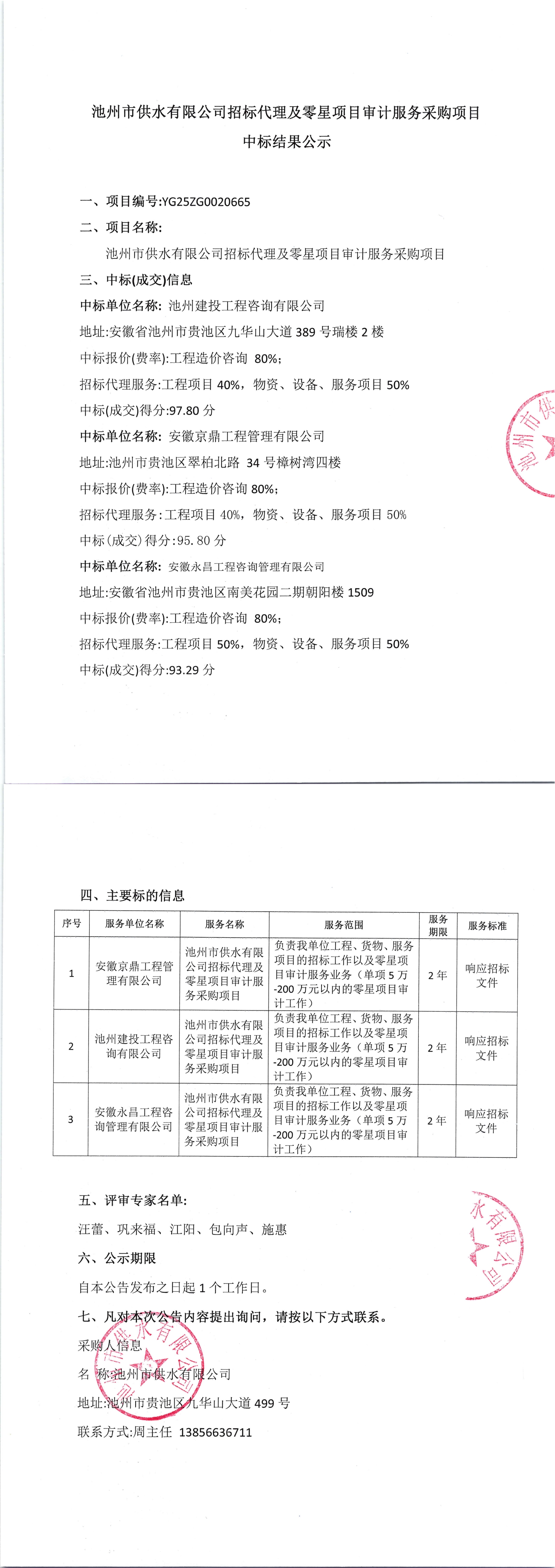 | 池州市供水有限公司招标代理及零星项目审计服务采购项目中标结果公示 | |