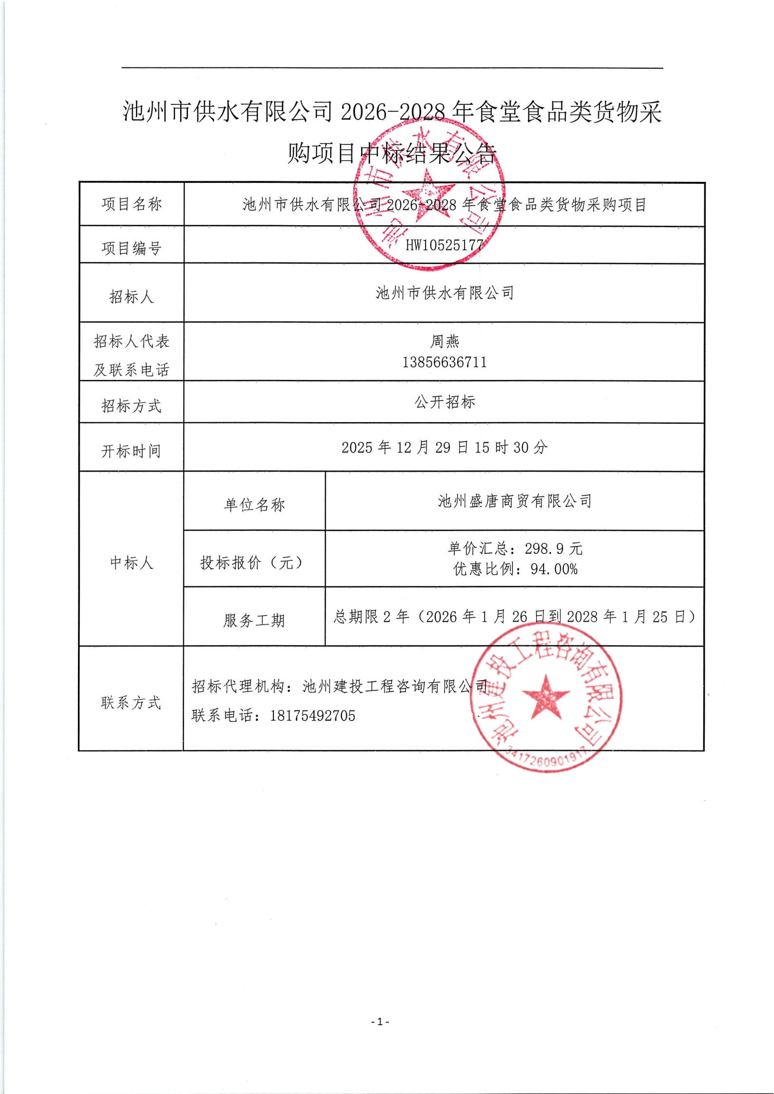 | 池州市供水有限公司2026-2028年食堂食品类货物采购项目中标结果公告 | |