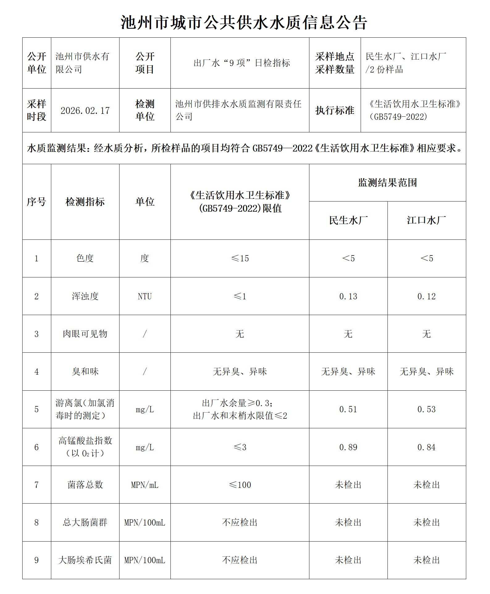 | 池州市城市公共供水水质信息公告出厂水“9项”日检指标2026.02.17 | |