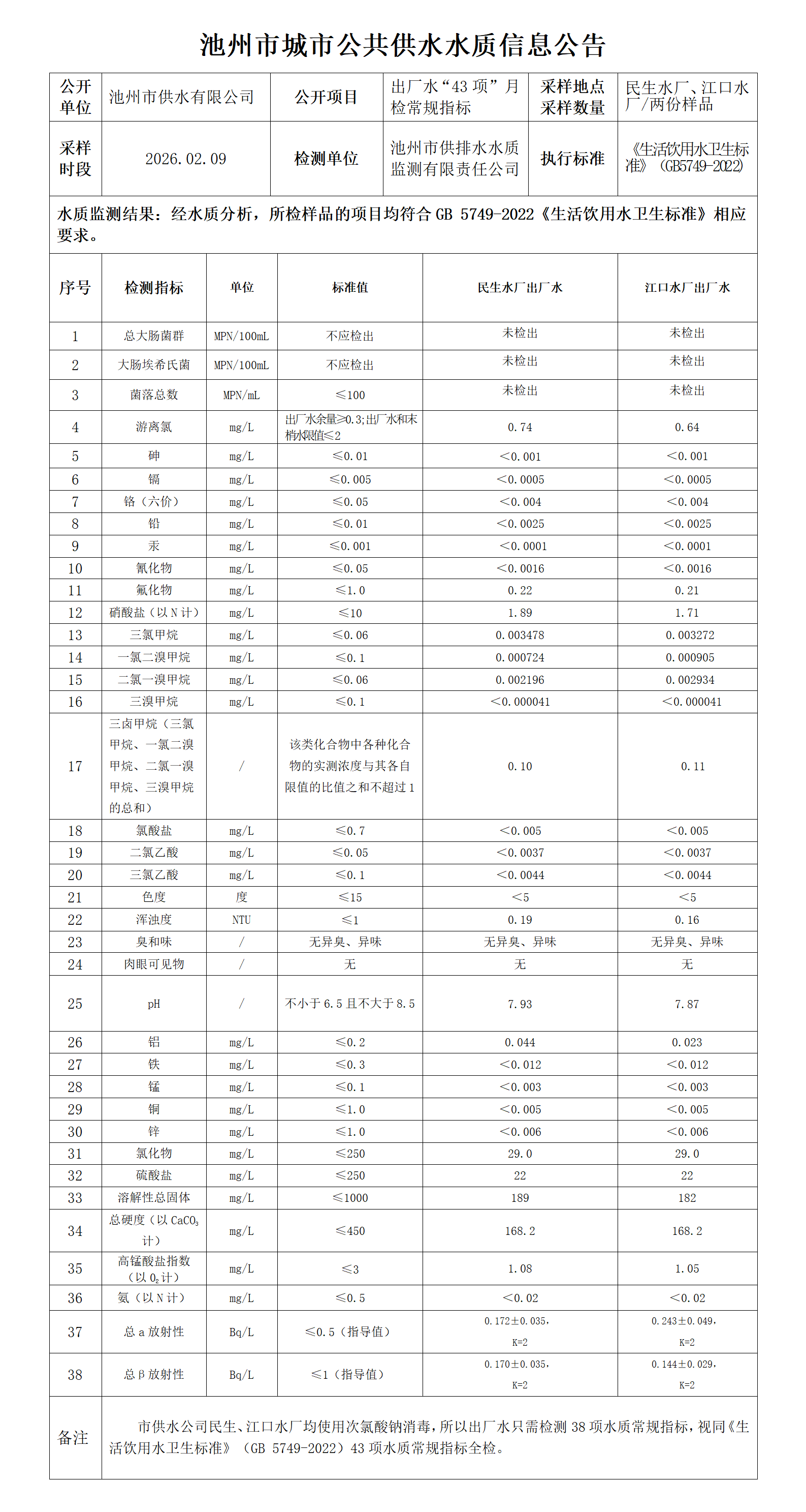 | 池州市城市公共供水水质信息公告2月份出厂水月检常规指标 | |