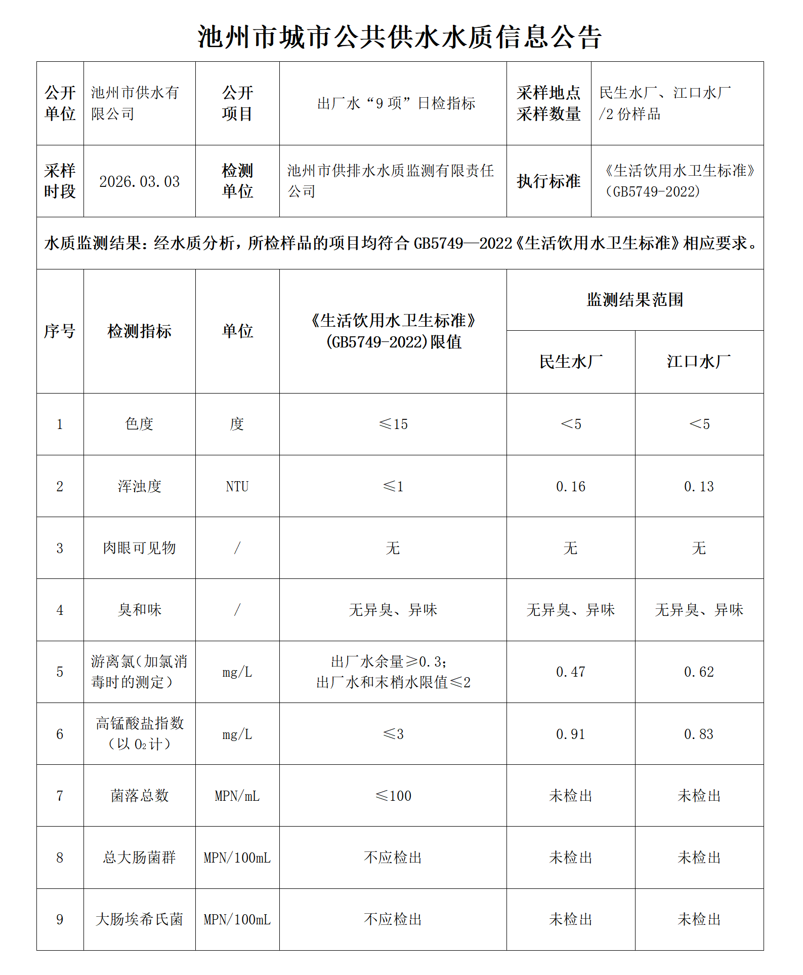 | 池州市城市公共供水水质信息公告出厂水“9项”日检指标2026.03.03 | |